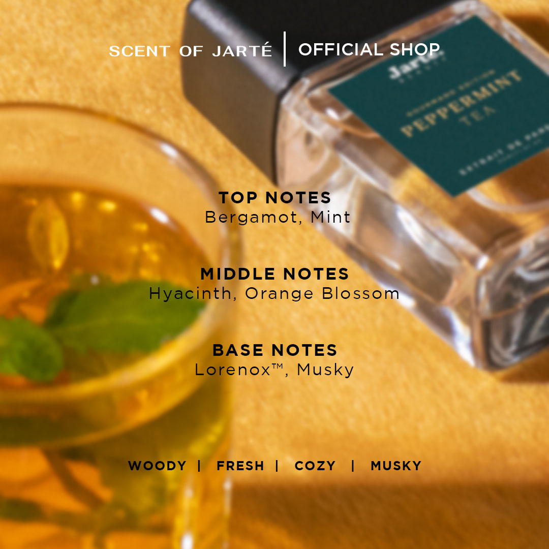 Inspired by the soothing warmth of Moroccan peppermint tea, this fragrance delivers a crisp, minty freshness balanced with subtle herbal notes. Perfect for those seeking a revitalizing yet calming scent experience. The top notes feature fresh bergamot and a burst of peppermint, bringing an energizing and refreshing mood. Soft hyacinth and sweet orange blossom create a warm, floral and comforting scent, while woody and musky base notes envelop you in a cozy warmth, perfect for everyday elegance.